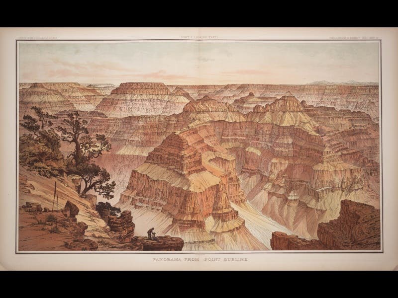 William Henry Holmes, American artist, geologist, and archaeologist, was born Dec. 1, 1846. In 1872, he joined Ferdinand Hayden’s Survey of the Territories, which was exploring the Rocky Mountains and the Yellowstone area at the time. Holmes was initially employed as the survey artist, but when Hayden's project was subsumed into the U.S. Geological Survey in 1879, Holmes continued on as both artist and geologist, and he quickly became one of the country’s finest geological illustrators. He did the artwork for Clarence Dutton's Tertiary History of the Grand Canyon District (1882), which is one of the most stunning geology books ever published. Holmes’ “Panorama from Point Sublime” is probably the most famous set of plates from this atlas; the first plate shows author Dutton and artist Holmes on the job in the foreground (see first image above); two more plates complete the panorama (second and third images above). When we mounted our Science Goes West exhibition in 2004, we had the first plate on display in the entry foyer to the Library; it is a full 30 inches across and made quite a spectacular invitation to the library and the exhibition. In the detail of the first plate (fourth image above), you can see Holmes with his sketch pad at the right, with Dutton looking over his shoulder.
