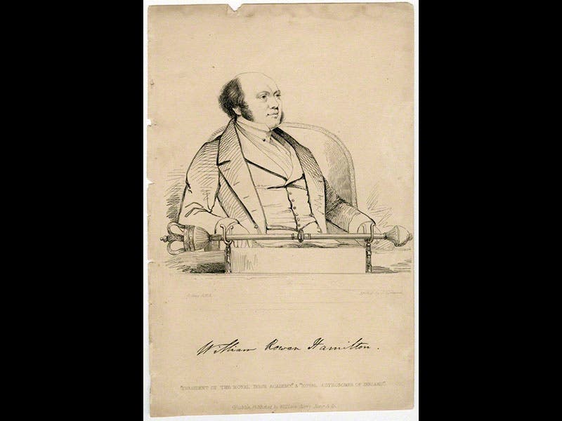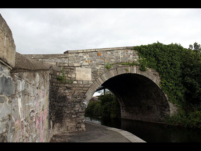 However, for those of us who are not higher mathematicians, the story of how quaternions came to be discovered might be of more interest. Hamilton announced his discovery in three short papers in three issues of the London, Edinburgh, and Dublin Philosophical Magazine in 1844 (all of them in one volume in our Library), and in the last he appended a copy of a letter that he had written the previous year to a friend. In the letter, Hamilton revealed that he had had his quaternion moment the day before, on Oct. 16, 1843. He had been out walking with his wife, and the flash of insight came when they were strolling by the Broom Bridge that crosses the Royal Canal in Dublin. Hamilton says that he immediately carved a quaternion expression into one of the stones of the bridge. This has become a celebrated tale in the history of mathematical discovery, and although the hand-carved inscription can no longer be found, a stone plaque was attached to the bridge many years ago, commemorating Hamilton's discovery, and whenever mathematicians meet in Dublin for a conference or symposium, a trek to the Broom Bridge is always on the agenda.