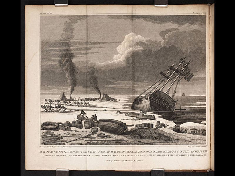 In 1816, on a visit to Spitsbergen, the hull of his ship suffered a gaping hole when it was rammed by an underwater projection from an iceberg. Scoresby emptied the ship and actually tried to turn it upside down in the water to repair it (second image). This was unsuccessful, so he resorted to fothering the ship, where the hull is wrapped with a sail containing shredded rope covered with tar. This plugged the hole well enough that they could pump out the water and repair the hull from the inside.