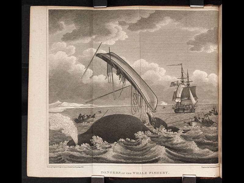 Scoresby’s Account of the Arctic Regions (1820) has a graphic frontispiece depicting the dangers of whaling (fourth image); it is also the source of the first three images above. We have now acquired his Journal of a Voyage to the Northern Whale-Fishery (1823), which is an account of an 1822 expedition to Greenland. After he returned from this voyage, Scoresby went to Cambridge, earned a divinity degree, gave up his Arctic exploration, and was elected a Fellow of the Royal Society. There is a memorial to both Scoresbys, father and son, in Whitby (fifth image). The crow’s nest was chosen because it was invented by the father, William Senior.